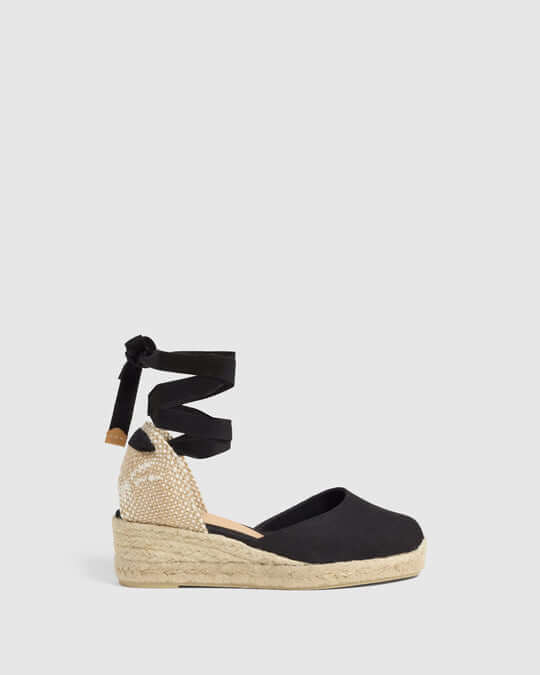 Aunque para las amantes de las alpargatas tradicionales heredadas del mediterráneo, encontramos este modelo sencillo y elegante de Castañer. Con puntera cerrada y redondeada en color negro, una lazada que se ata al tobillo y una cuña sensata de esparto, esta pieza es preciosa para estilizar el pie mientras vas cómoda. Ya la imaginamos con un vestido midi y bolso de rafia (105 euros).