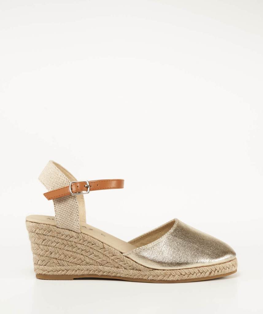 La moda de los zapatos metalizados ha llegado a estas alpargatas de tacón sensato con piezas como esta de Marypaz, con puntera dorada y sujeta al tobillo con una correa camel que contrasta. Esta es ideal tanto para ir al trabajo con una camiseta y un pantalón de lino como para ir a un evento con un vestidazo. Además, está tirada de precio (25,99 euros).