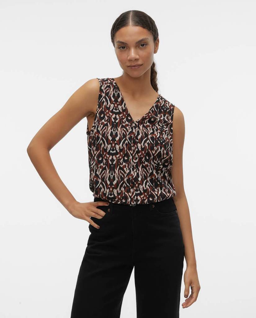 Las mujeres +50 más calurosas aman este tipo de blusas sin mangas, porque son todavía más livianas para soportar las altas temperaturas. Además, si cuentan con tejidos fluidos como en este modelo de Vero Moda, mucho mejor. Esta es confortable al no ajustarse nada, y además su estampado estiliza un montón. Ya la vemos para la noche con una falda midi negra y cuñas de esparto. Y, de nuevo, está tirada de precio ahora en El Corte Inglés (26,99 euros 18,89 euros).