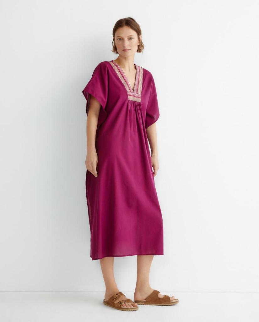 El vestido de lunares de Hipercor no es solo una excepción, pues este hipermercado del grupo El Corte Inglés cuenta con muchísimos más modelos que enamorarán a las mujeres +50 por su diseño y por su precio. Es el caso de este caftán fucsia súper holgado y con esos detalles bordados en el pecho. Esta prenda ideal para las vacaciones de verano en la playa solo cuesta 19 euros.
