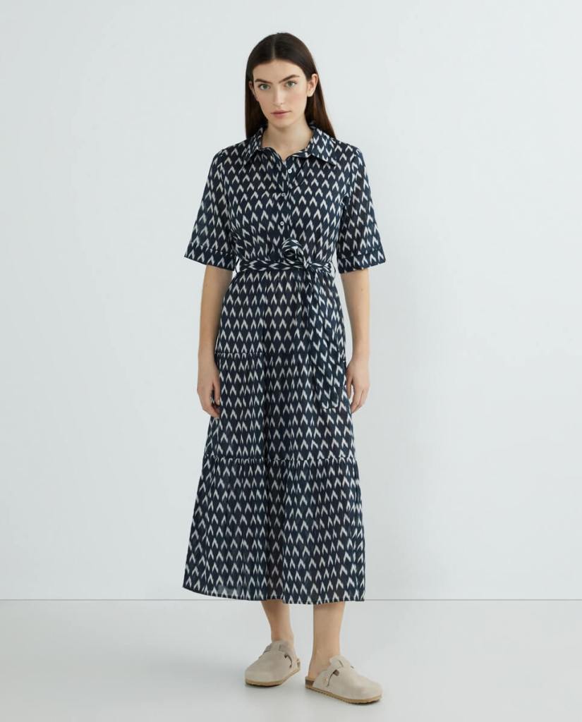 Las siluetas camiseras son unas de las favoritas entre las mujeres +50 porque estilizan y son súper cómodas. En este sentido, en Hipercor cuentan con esta opción estampada en azul marino y blanco que tiene un diseño extra ancho que se ajusta a la cintura con un lazo a juego (21 euros).