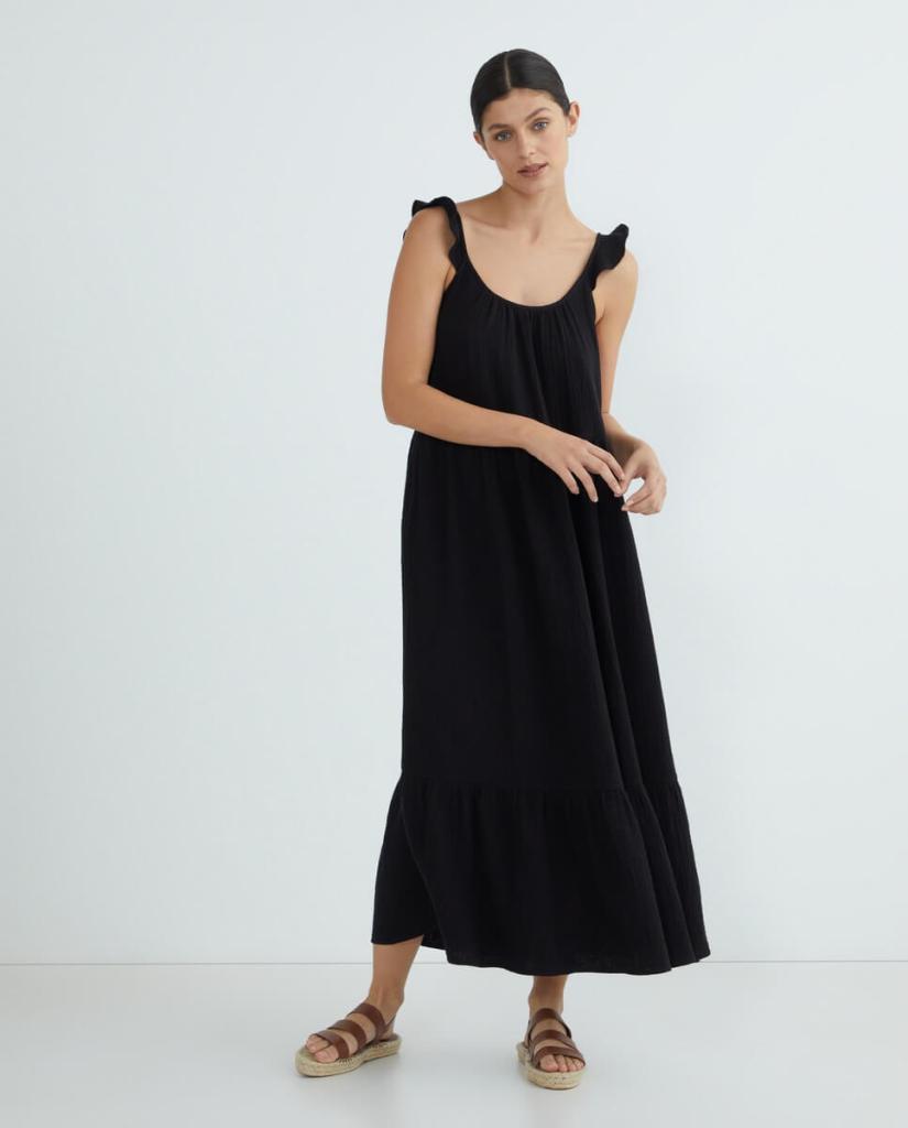 Como opción final, os dejamos este vestido de tejido rústico en negro que no se ajusta por ningún lado y que es versátil para llevar con todo. Desde con el bañador y las chanclas para ir a la playa hasta con unas sandalias de tacón doradas para ir a cenar. Y esta propuesta de Hipercor también es bastante asequible (21 euros).