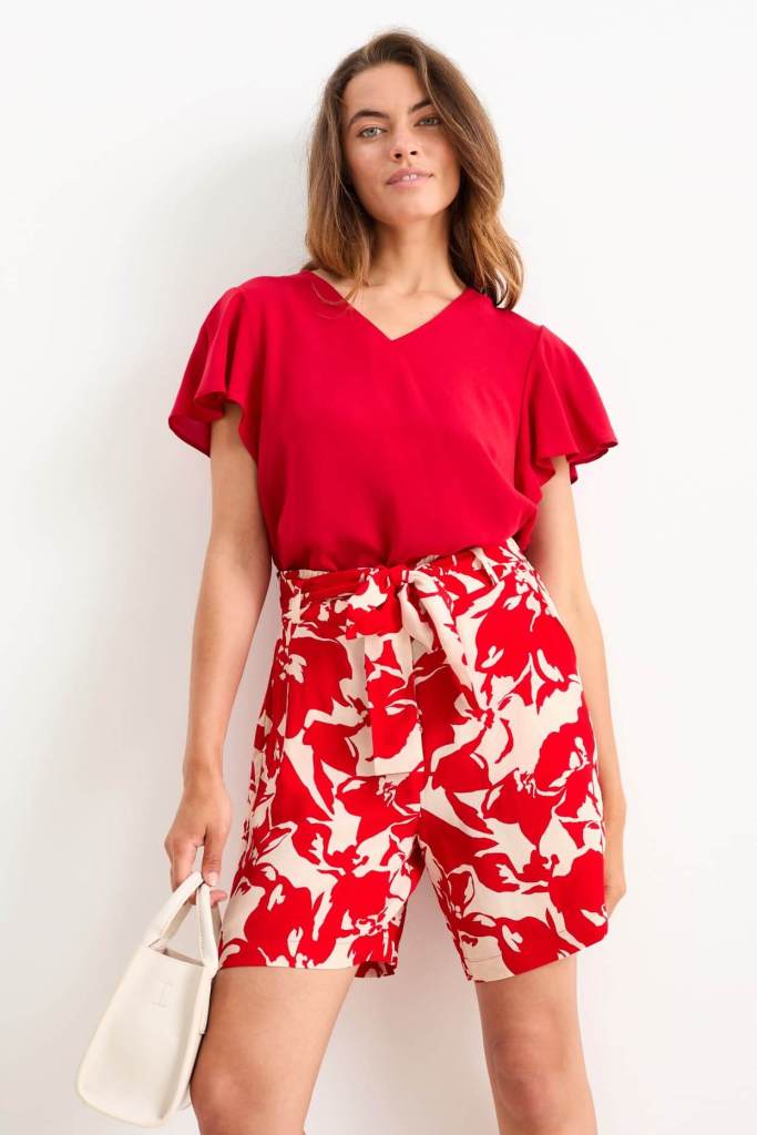Para ocasiones más especiales, como puede ser una cena arreglada, este short de C&A nos parece ideal. Cuenta con un estampado de flores en rojo y beis que lo hace elegante, y de nuevo es cómodo al ser holgado y tener cintura elástica. Las mujeres +50 seguro que apuestan por él para llevarlo con una blusa de manga corta roja y con complementos como un bolso y unas sandalias de tacón sensato en color crudo. También es muy barato (23,99 euros).