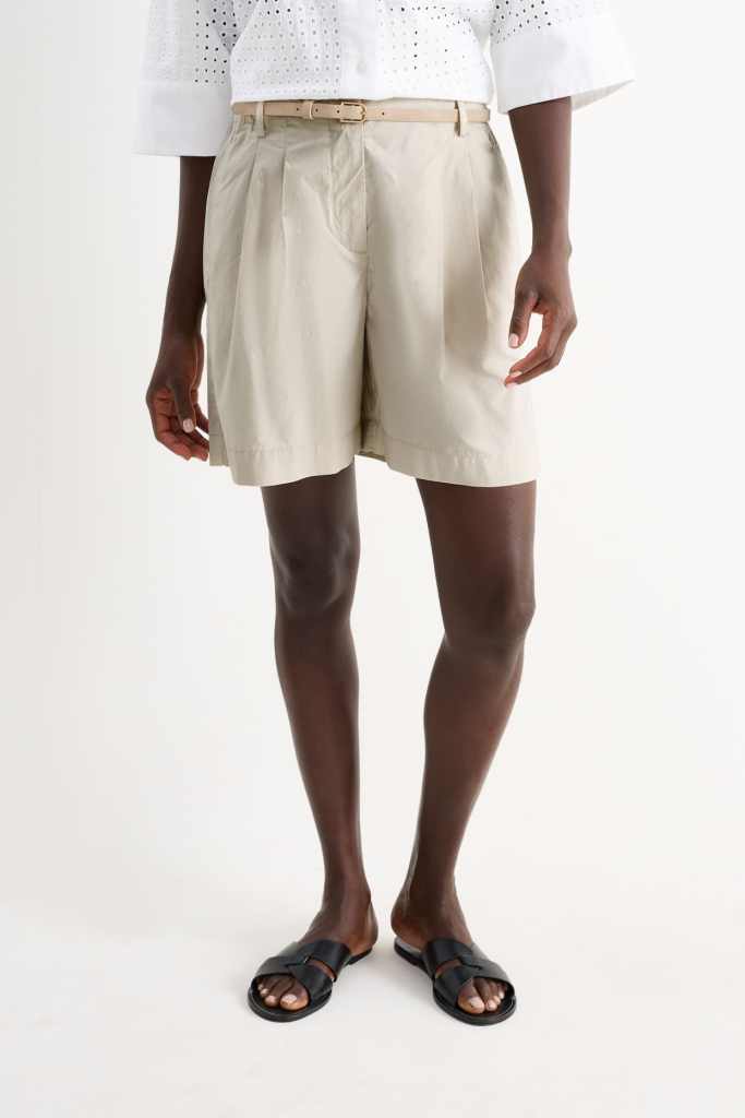 Una opción más formal para llevar a la oficina o para lucir con blusa son estos pantalones cortos con pinzas. Su tono beis neutro y versátil lo hacen elegantes para combinar con una camisa de manga corta con bordados ingleses y unas sandalias pala. Así irás arreglada del día a la noche. Una vez más son ligeros y anchos, y esta vez van acompañados de un cinturón estrecho de antelina con hebilla metálica redondeada. Y están tirados de precio también (16,99 euros).