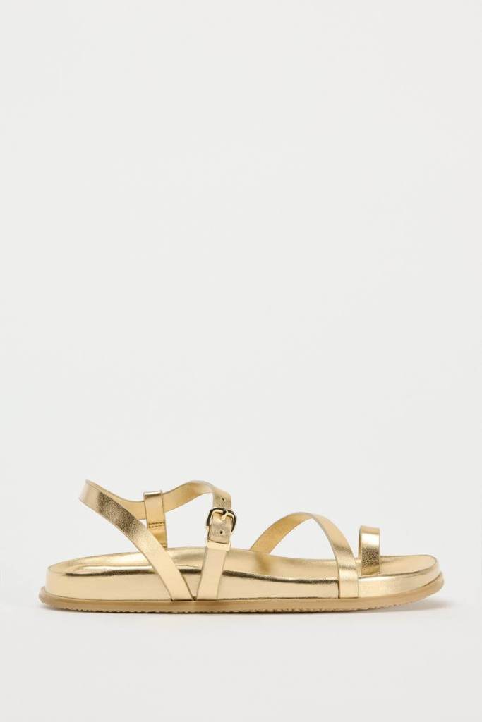 Sandalias planas con efecto metalizado, detalle de tiras en la parte de delante con posición para el dedo y cierre mediante hebilla en la pulsera al tobillo, de Zara. Precio: 29,95 euros (Ref: 2622/310).