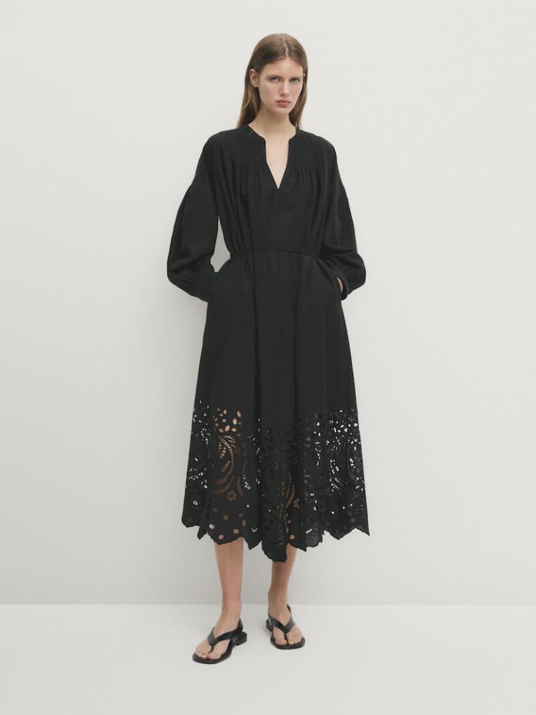 Los vestidos camiseros son uno de los más cómodos y aptos para verano, sobre todo para la noche. Este modelo negro con bordados en el bajo es la prueba de ello, porque nos encanta para llevar con alpargatas de cuña a una cena en una terraza. Este pasa de costar casi 100 euros a menos de 60 por su descuento del 40% en las rebajas de Massimo Dutti (99,95 euros 59,95 euros).