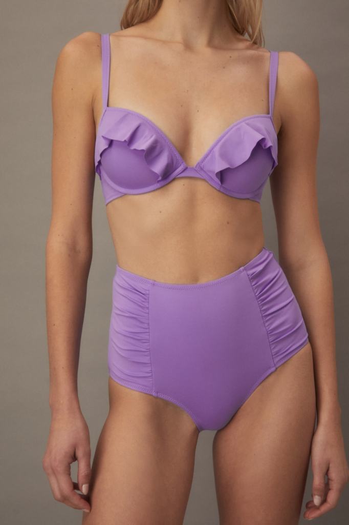 He aquí el modelo al que nos referíamos en el titular. Es perfecto para esas mujeres de 20, de 40 o de 60 que quieran disimular la zona del abdomen, o simplemente porque por comodidad les guste lucir estas braguitas altas en sus chapuzones estivales. Esta llega al ombligo y cuenta con unos fruncidos laterales que hacen que siente fenomenal. En cuanto al top de este bikini de Sfera, es ideal para las que quieran añadir volumen al pecho por ese volante que lo decora, que además aporta movimiento.