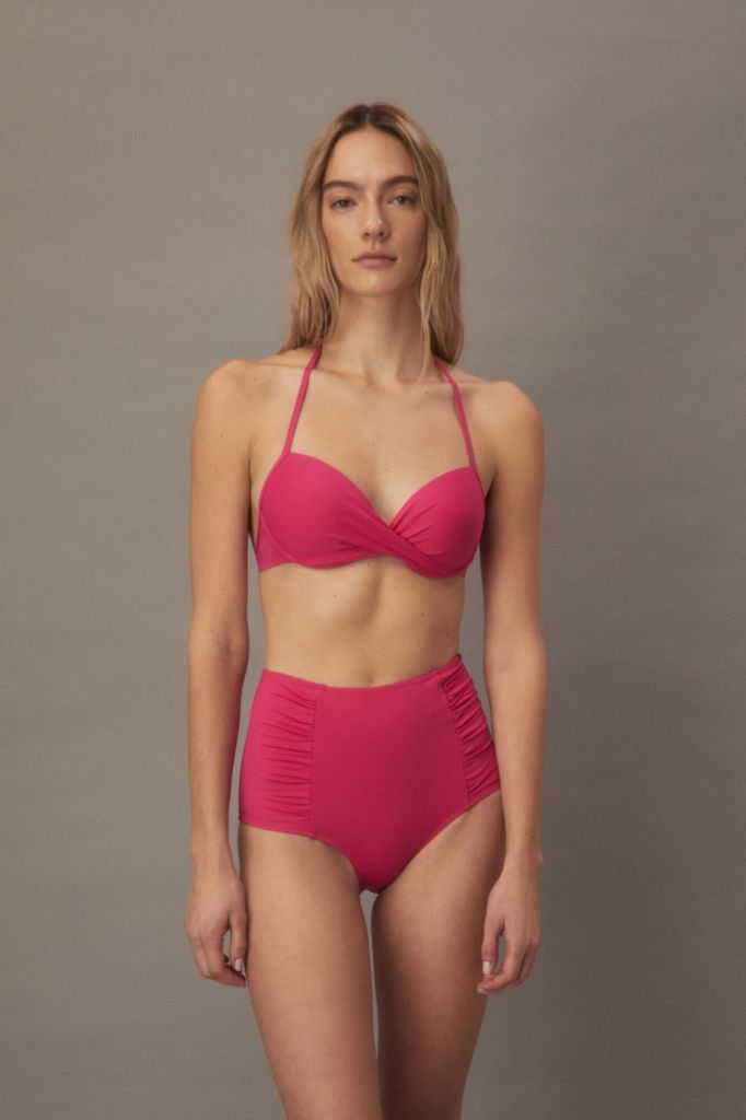 Aunque el color lila anterior nos encanta porque aporta mucha luz y es súper dulce, este bikini de Sfera está disponible en más colores. Es el caso de este tono fucsia llamativo, perfecto para esas mujeres que les gustan las tonalidades más atrevidas. Aunque la braguita es igual siempre, la parte de arriba sí que cambia dependiendo del color. En este caso, se trata de un top con push up liso pero con ese detalle de nudo en la zona central del diseño. Este es perfecto para aquellas que quieran elevar su pecho y armarlo.