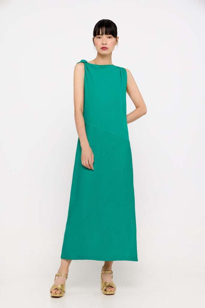 He aquí el vestido de Cortefiel que nos enamorado de sus rebajas. Y no solo por su precio con descuentazo, pues solo hay que ver esta foto para imaginar lo elegante y bonito que puede quedar para una boda, un bautizo o cualquier otro evento estival. E incluso si quieres arreglarte mucho para una cena especial, es una pieza que viste y estiliza muchísimo. A simple vista, vemos que es un vestido largo de cuello redondo y manga sisa. Y, en este caso, cuenta con un color verde perfecto para las mujeres +50 más atrevidas.