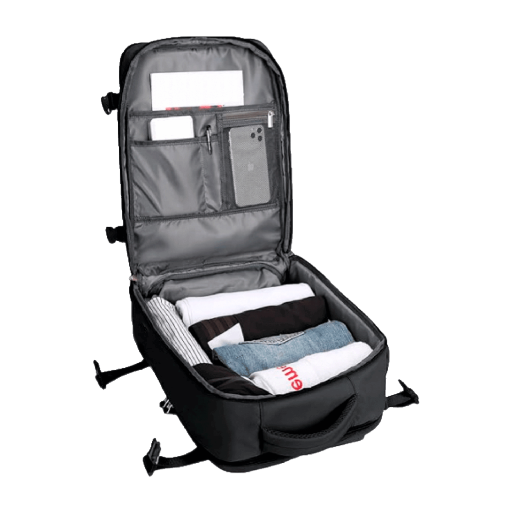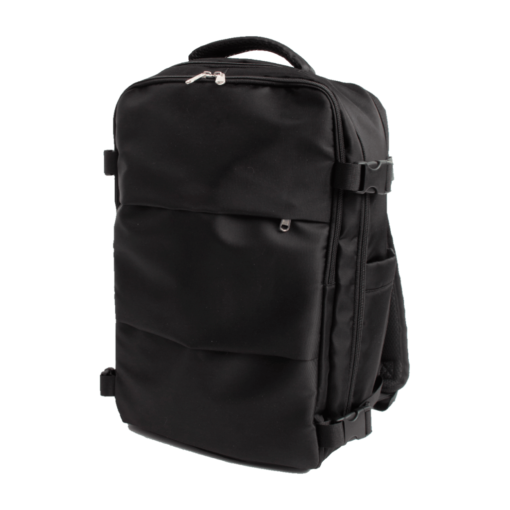 Pero lo mejor de esta mochila de Aldi es la facilidad con la que se puede organizar el equipaje dentro de ella por sus múltiples compartimentos. El principal y el más grande simula como si lleváramos una maleta de mano, ya que tiene gran hueco y además incluye un organizador de zapatos para separarlos de la ropa y muchos otros bolsillos interiores para llevar accesorios, para meter la ropa sucia, los cosméticos, etc. En esta imagen se aprecia a detalle esto que hemos descrito. Pero es que en su diseño exterior también cuenta con muchísimos compartimentos.