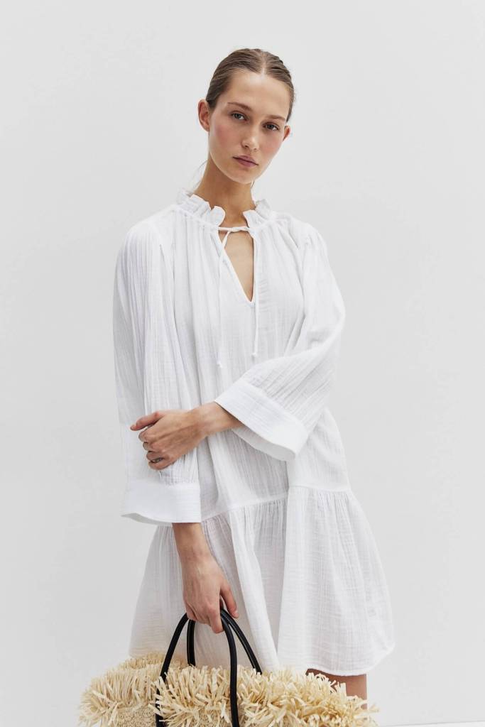 Si prefieres los modelos cortos y súper fluidos, este vestido blanco de H&M nos parece una buena opción. Es súper fresquito por el tejido ligero con el que está creado, así que es perfecto para acompañar a la ropa de baño en la playa, y complementarlo con un capazo. Aunque al tener ese cuello corto de volantes, la abertura en V con cordón de ajuste y las mangas globo, también nos encanta para llevar a una cena con unas sandalias de tiras. Y este sí que está tirado de precio, pues cuesta menos de 14 euros (29,99 euros 13,99 euros).