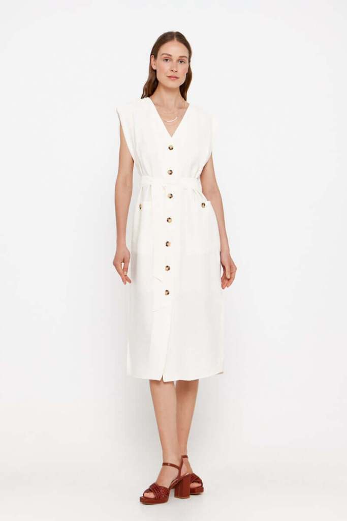 Aunque si buscas una opción más elegante que te pueda servir para las ocasiones más formales, en Cortefiel encontramos este modelo blanco abotonado. Este modelo midi de escote pico y manga sisa, estiliza mucho por su silueta fluida y recta, aunque para las que quieran marcar cintura pueden ceñirlo con su cinturón a juego. Nos encanta para combinarlo con unas sandalias de tacón doradas y bolso a juego. Y este es todo un chollo, pues está rebajado un 50% y pasa de costar casi 80 euros a menos de 40 (79,99 euros 39,99 euros).