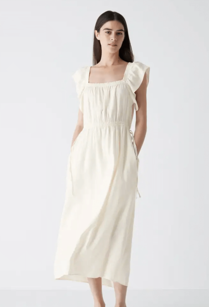 De vuelta a los vestidos blancos largos, en Uniqlo encontramos este otro modelo que nos ha encantado por su escote cuadrado. Este es liso, así que es versátil para combinar con otros colores o materiales, y se caracteriza por ser ligero al estar creado con una mezcla de lino suave y cómodo. Las mangas son acampanadas, y cuenta con un fruncido en la cintura que se puede ajustar según el gusto. Este se queda por menos de 20 euros en sus rebajas de verano (49,90 euros 19,90 euros).
