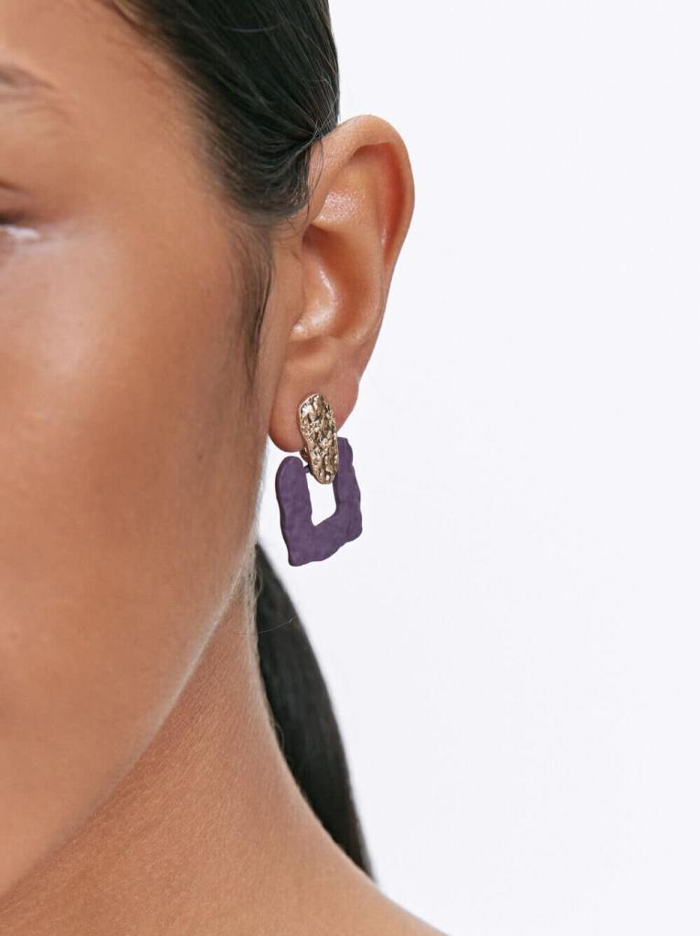 Si eres más de los pendientes que cuelgan un poquito, este modelo pequeño con silueta cuadrada en mate y en color morado puede ser una buena opción para esas mujeres +50 de pelo corto. Su broche dorado con material irregular destaca mucho, y nos parece ideal para ser el protagonista de un estilismo en blanco, por ejemplo. Una vez más, cuesta menos de 5 euros (5,99 euros 2,99 euros).