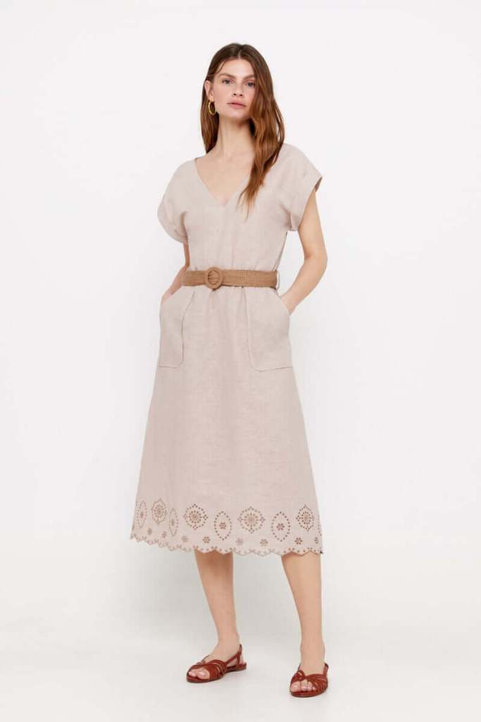 Aunque los vestidos estampados invaden el verano con su aura divertida y colorida, en Cortefiel también encontramos modelos neutros que pegan con todo y que resultan súper elegantes. Hablamos por ejemplo de este vestido de estilo rústico en color beis, que combina tanto con blanco, con tonos tierra, con negro... Este destaca por tener una silueta que estiliza con manga corta, escote pico y bolsillos, pero sobre todo por ese bordado del bajo y el cinturón a contraste con el que lo puedes ajustar a la cintura. También está tirado de precio (79,99 euros 19,99 euros).