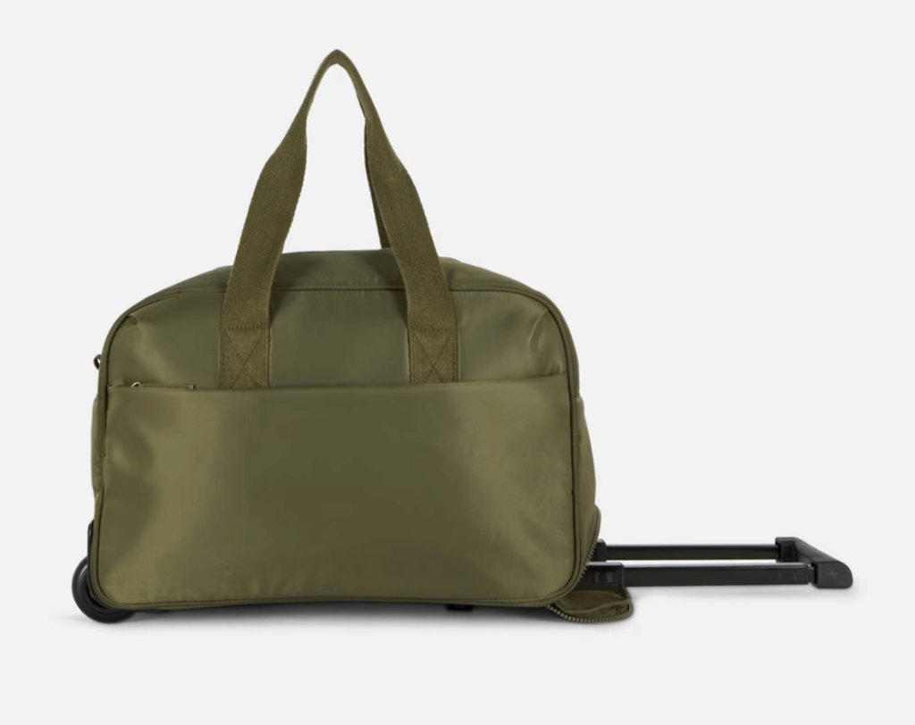 Entre sus novedades de productos de viaje encontramos también otras opciones prácticas e ideales para no facturar maleta si viajas en avión. Es por ejemplo el caso de esta bolsa de viaje de Primark con asa y ruedas, fácil de transportar y súper útil. Aunque la marca low cost ya contaba con otras opciones parecidas, esta es más compacta y además tiene este color caqui tan en tendencia (28 euros).