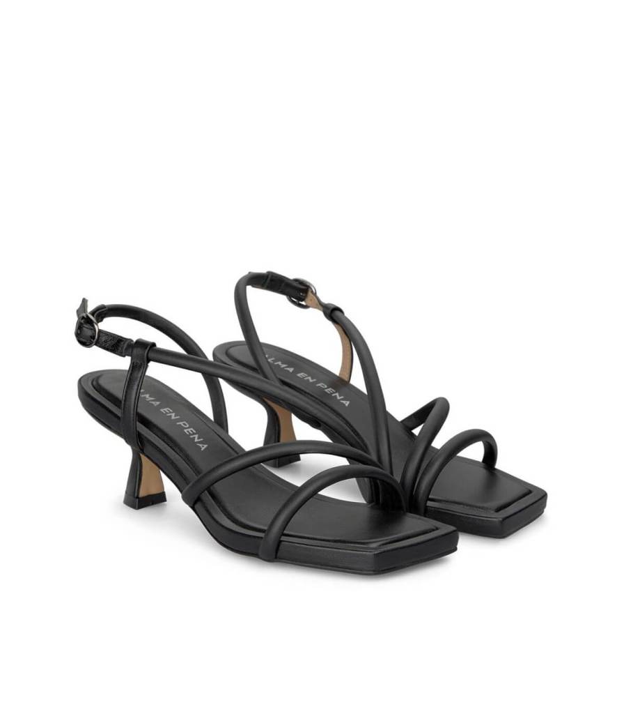 Con un estilo más original, en Alma en Pena tienes estas sandalia de tacón bajo negras estilo chupete. La puntera es cuadrada y los cordeles hacen que se sujete al pie. El tacón es de 6cm. 92 euros.