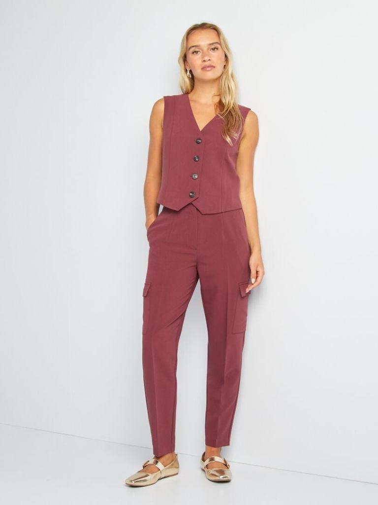 Y para las mujeres que quieran darle a este dos piezas un toque más rejuvenecedor, nos encanta este modelo de Kiabi. Su chaleco de vestir tiene una silueta muy clásica y está tirado de precio (12 euros). Pero es que su pantalón es súper moderno al ser de estilo cargo con esos bolsillos laterales (18 euros).