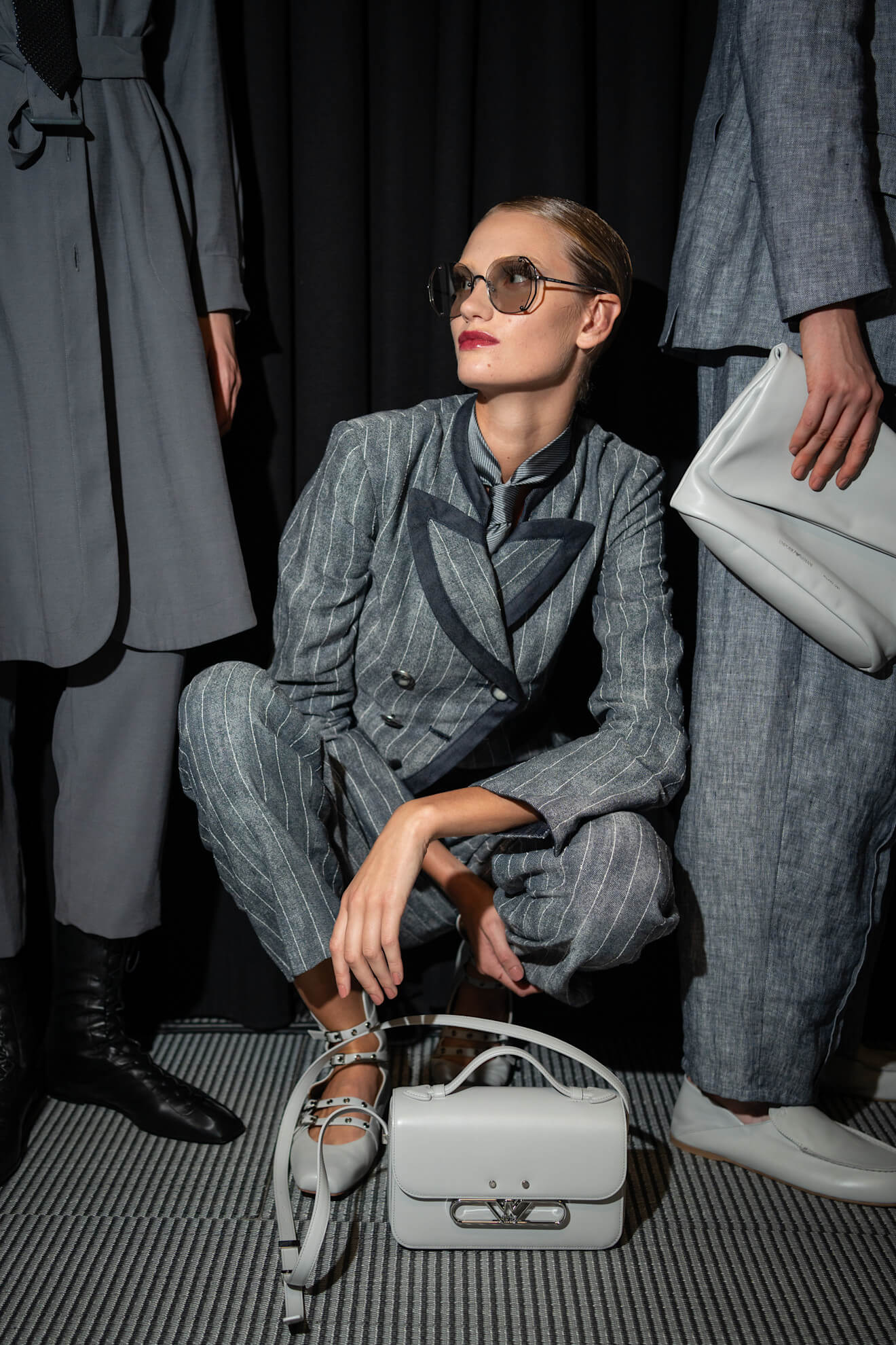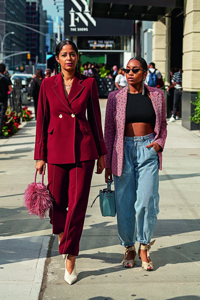 Combinar tejidos básicos con accesorios con texturas es una buena opción. En este look, vemos que el traje es el protagonista, pero los pequeños detalles, como un bolso con un estilo muy característico, unas deportivas blancas y unas gafas de carey, dan personalidad y fuerza.