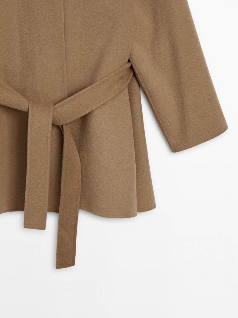 En la web de Mango hay una versión larga de este estilo de abrigos con cinturón. Este tejido es en lana, con un diseño handmade y oversize.