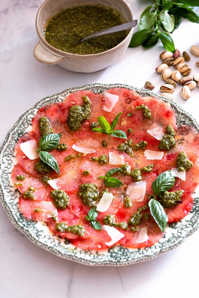 “La sandía es un ingrediente perfecto para hacer carpaccio. Pero para darle sabor, ¿qué mejor que un pesto?”, dice Patri Tena. Ella recomienda el de pistachos porque “el ligero punto amargo y salado del parmesano que contrasta con el dulce y fresco de la sandía. Ligado con el aroma fresco de la albahaca y buen AOVE”, señala. “Sin duda un plato para sorprender”, concluye. Esta es la receta: