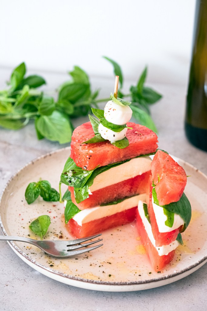 - Monta la ensalada en vertical comenzando con una rodaja de sandía, una de mozzarella y unas hojas de albahaca, hasta que termines.