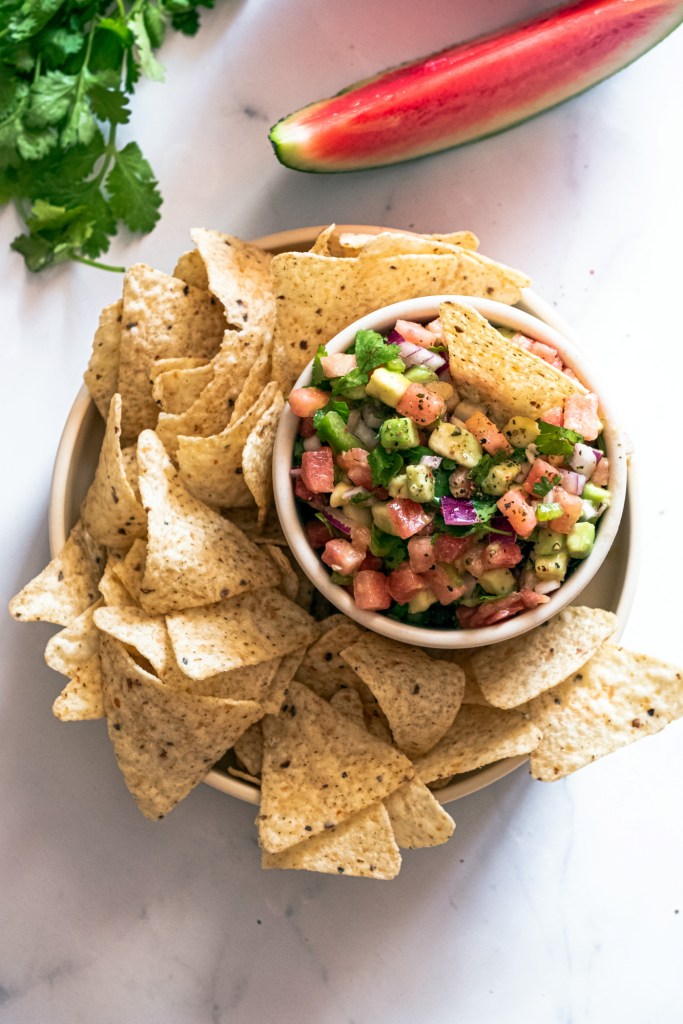 Esta receta, según Patricia Tena, es ideal para el verano. “Fresca, aromática y ácida, con un ligero toque picante, que el dulce de la sandía suaviza, a la vez que acompaña este combo de sabores”, dice la experta en cocina saludable casera. “Es ideal como guarnición, para acompañar tacos o, como esta vez, para dipear con totopos”, añade.