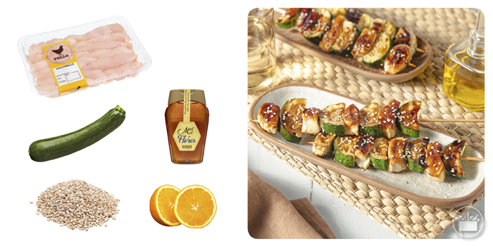- Ensartar el pollo y el calabacín en una brocheta, alternándolos.