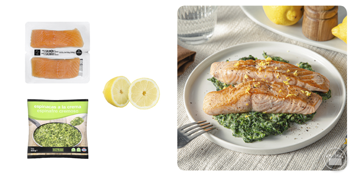 - Emplatar poniendo en la base del plato una capa generosa de espinacas a la crema y sobre esta el salmón.