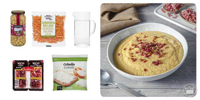 - Saltear unos taquitos de jamón en una sartén para que tuesten. Emplatar en un plato hondo la crema y el jamón por encima para terminar.