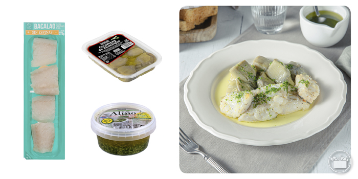 - Emplatar disponiendo el bacalao y las alcachofas en un plato y condimentar el conjunto con el aliño de aceite, ajo y perejil.