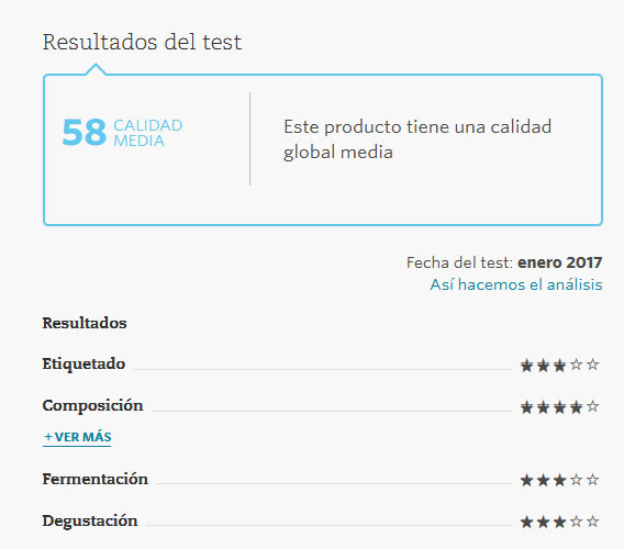 Su origen es español. Una lata de 330 ml de capacidad cuesta 0,23 €. Sus ingredientes son agua, malta de cebada, maíz, cebada, lúpulo, colorante (E150c) y estabilizante (E-405). Su valoración es de 60 sobre 100.
