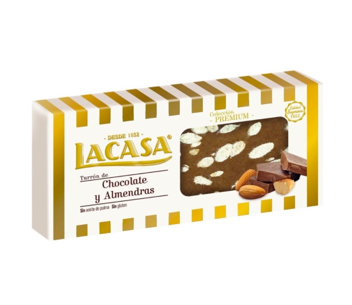 Este delicioso turrón de chocolate con leche con almendras enteras tostadas está elaborado sin aceite de palma ni gluten. De Lacasa (250gramos /4,99 euros)