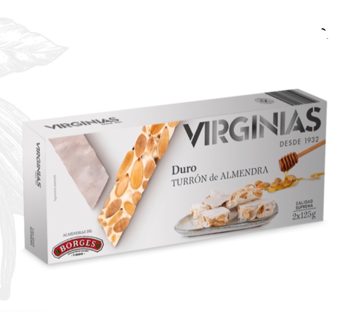 Este turrón artesanal está elaborado con almendra (55% mín.), azúcar, jarabe de glucosa, fructosa, miel, oblea y clara de huevo. De Virginias (250 gramos /5,50 euros)