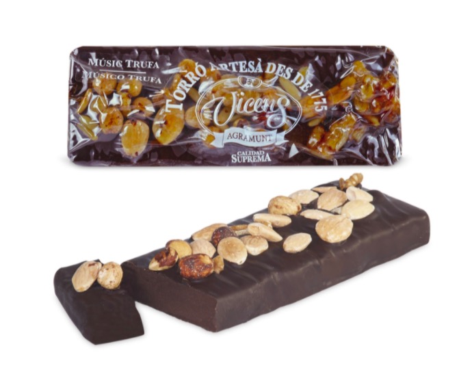 Esta barra de turrón de chocolate relleno de masa de trufa y cubierto de frutos secos te encantará. De Torrons Vicens (300 gramos /7,30 euros)