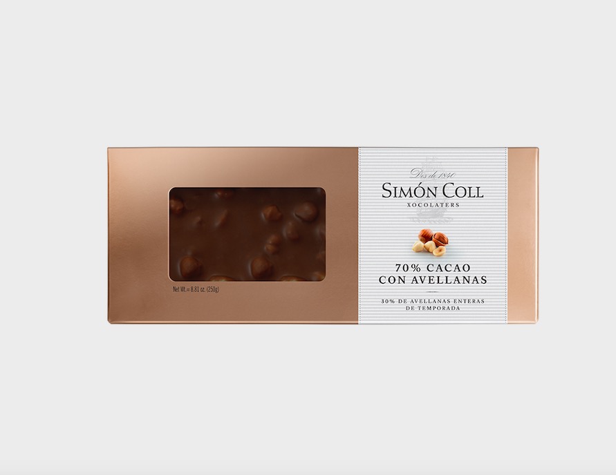 Elaborado con habas de cacao, siguiendo un método tradicional de selección, tostado, refinado y conchado. Con chocolate con 70% cacao y con un alto contenido (30%) de avellanas enteras. Dede Simon Coll (250 gramos / 4,95 euros)