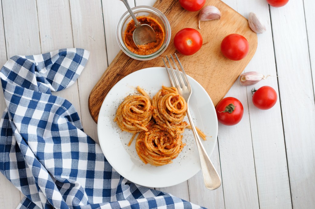 La única combinación que en España le ha discutido su monopolio al pesto genovés es el llamado pesto rosso, del que ya te hablamos recientemente, que se puede hacer con tomates secos o frescos (pesto alla trapanese), y no es más que añadirlos a los mismos ingredientes del genovés reduciendo un poco el peso de la albahaca en la mezcla en favor del rojo de los tomates. Para darle un toque más original al rosso, puedes probar a variar los piñones por otro fruto seco como las avellanas o las almendras.