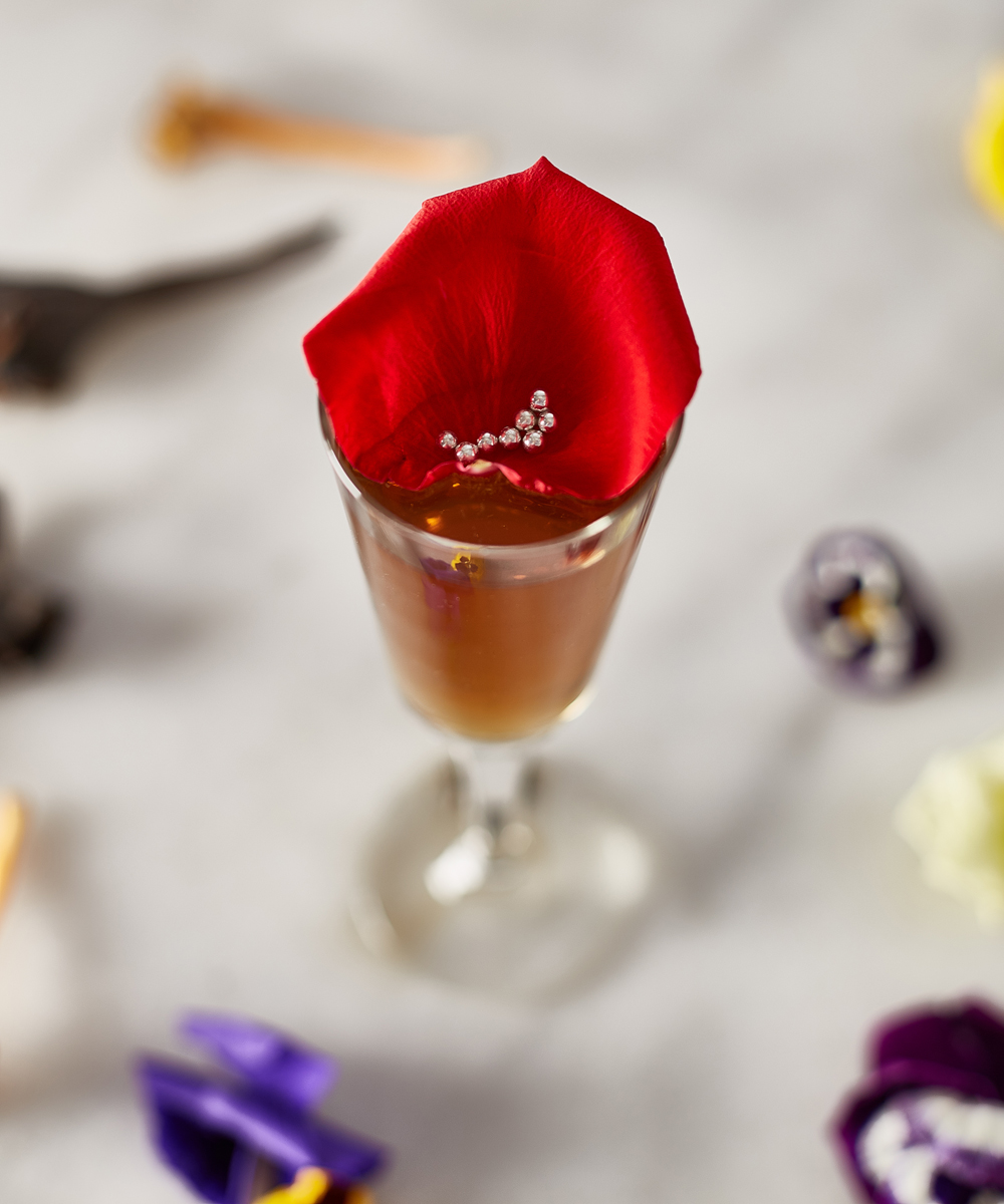 Receta del cóctel "La esencia del cambio": 50 ml ron Zacapa 23; 25 ml puré de Bergamota; 10 ml azúcar de vanilla; 15 ml licor de naranja ; Pétalos de rosas; Perlas de azúcar plateadas; Polvo de oro; Incenso. Servir en un vaso tipo flauta.