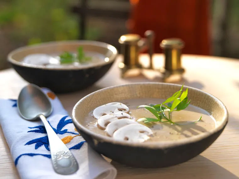 - Antes de llevar a la mesa, calentar la crema, añadir un chorrito de nata líquida y mezclar. Verter en unos cuencos, decorar con las setas laminadas reservadas y una ramita de perejil. Sazonar con unas vueltas de molinillo de pimienta cinco bayas y servir caliente.