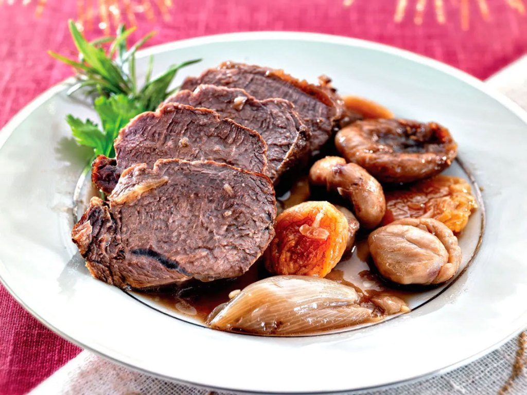 - Servir la carne fileteada y rociada con la salsa, acompañada con la guarnición de higos, castañas y orejones.