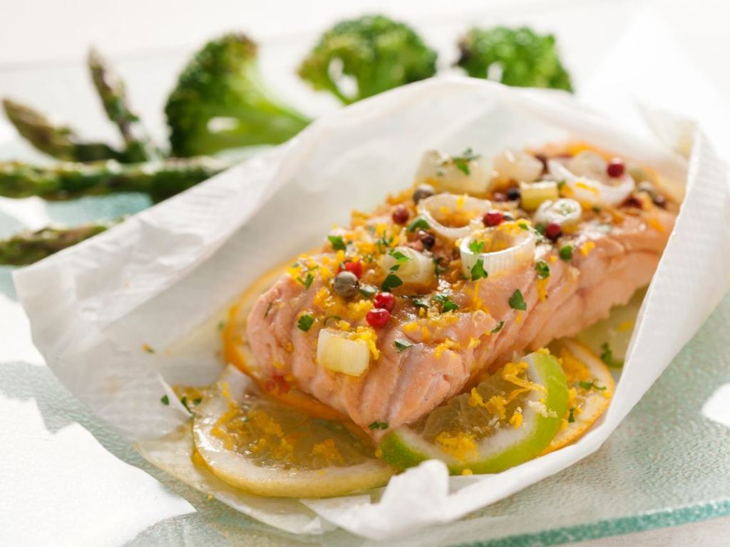 Introducimos en el horno y horneamos durante 12 a 15 minutos. Luego, abrimos con cuidado el paquete para no quemarnos, y servimos con rodajas de limón.