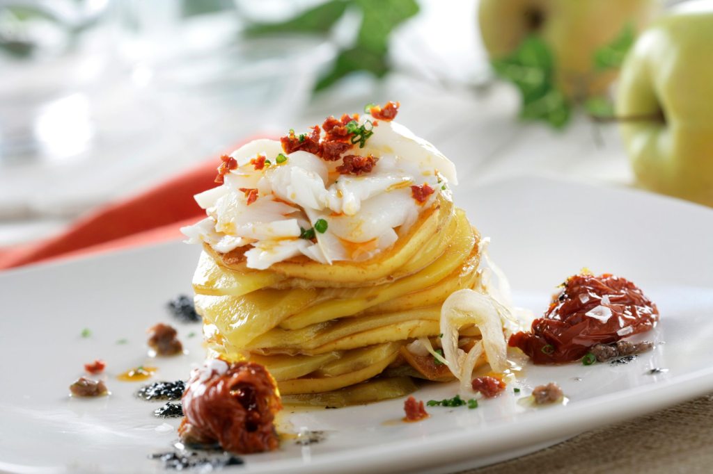 Emplata así: una lámina de patata, otra de manzana y la del foie. Repite la operación y corona formando una flor con la lámina de manzana. Acompaña el plato con gelatina de Sauternes y decora con unas gotas de vinagre de Módena.