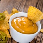 salsa cheddar en cuenco blanco junto a plato de nachos