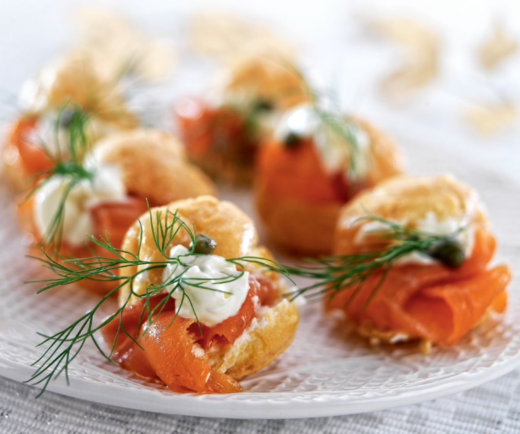 Mientras, añadir la mostaza y una cucharada de eneldo picado a la crema agria y poner el punto de sal al gusto. Abrir los profiteroles por la mitad (sin llegar a separarlos) y rellenarlos con una cucharada de crema agria; repartir unas alcaparras, poner un trocito de salmón ahumado en cada uno y una ramita de eneldo. Servir.