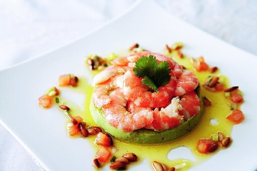 - Ponemos en el centro del plato un molde circular que rellenamos hasta la mitad de guacamole, colocamos encima los langostinos en forma de corona y salseamos con la vinagreta alrededor de la corona.