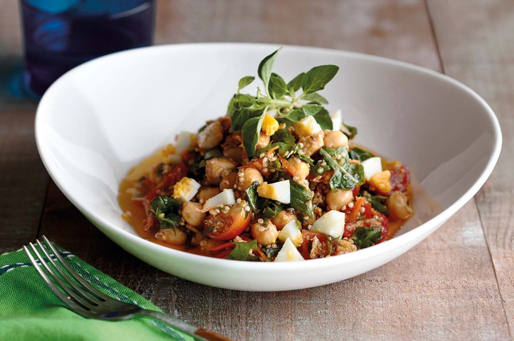 - Cortamos en trozos pequeños la zanahoria, el queso, la rúcula, el tomate cherry y el huevo duro e incorporamos a un cuenco o ensaladera. Añadimos la quinoa, los garbanzos, las pipas de girasol (si queremos, las podemos pasar unos minutos por la sartén), el sésamo y el lino y salamos a nuestro gusto con la sal marina.