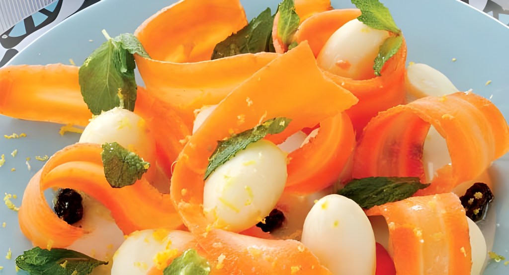 - En un cuenco poner 6 cucharadas de aceite, el zumo de naranja, la miel, sal y pimienta. Aliñar con la vinagreta las patatas, las zanahorias, las pasas y las hojas de menta.