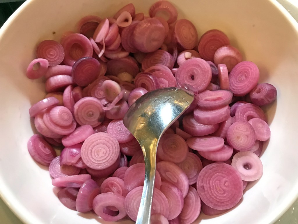 Es tan fácil como picar una cebolla morada en juliana y calentar medio vaso de vinagre —al gusto; uno de sidra de manzana, por ejemplo, va muy bien— y medio de agua con una cucharadita de sal en un cazo.