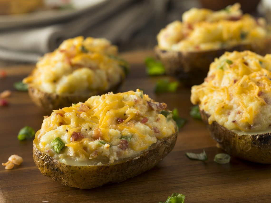 Son deliciosas y puedes rellenarlas con carne picada, pollo, vegetales, atún, jamón... Para hacerlas, lávalas, córtalas y ponlas en una fuente engrasada con aceite y cocínalas en el horno durante 60 minutos. Después rellénalas con lo que desees (que esté cocido) y cubre con queso parmesano. Gratina las patatas rellenas y sirve.