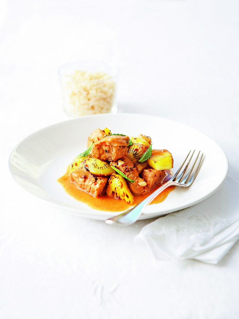 - Agrega el jugo de piña. Deja que se cocine durante 10 minutos, hasta que la salsa reduzca. Añade el solomillo sellado y cocínalo 2 minutos más. Cocina la piña y el kiwi en una plancha con unas gotas de aceite de oliva hasta que se doren.